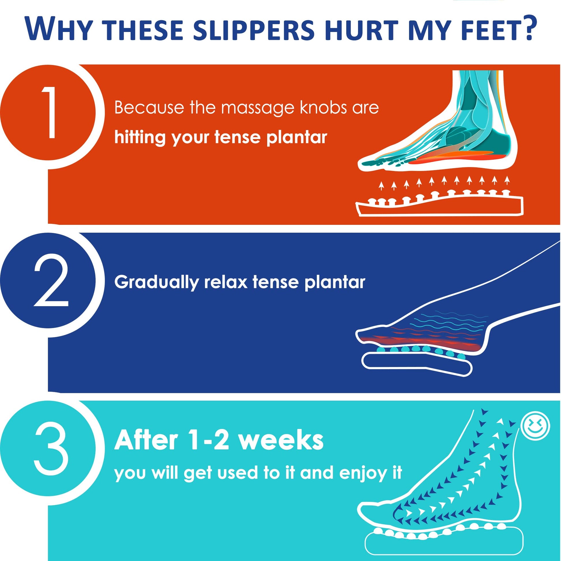 - ✔ PAINFUL SLIPPERS: When first using these therapeutic massage slippers, you may feel obvious discomfort or soreness. This is because the massage knobs are stretching tight plantar muscles. We recommend wearing socks and starting with 3-5 minutes per session. Gradual adaptation usually takes 1-2 weeks.